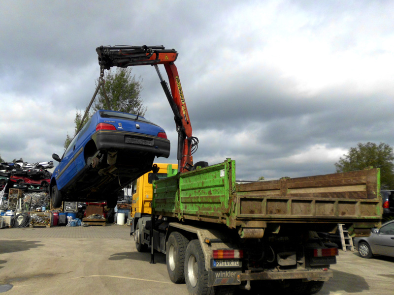 Gerne laden wir Ihre Abfälle, ihren Schrott oder Ihr Altfahrzeug vor Ort mit unserem LKW mit Ladekran auf.